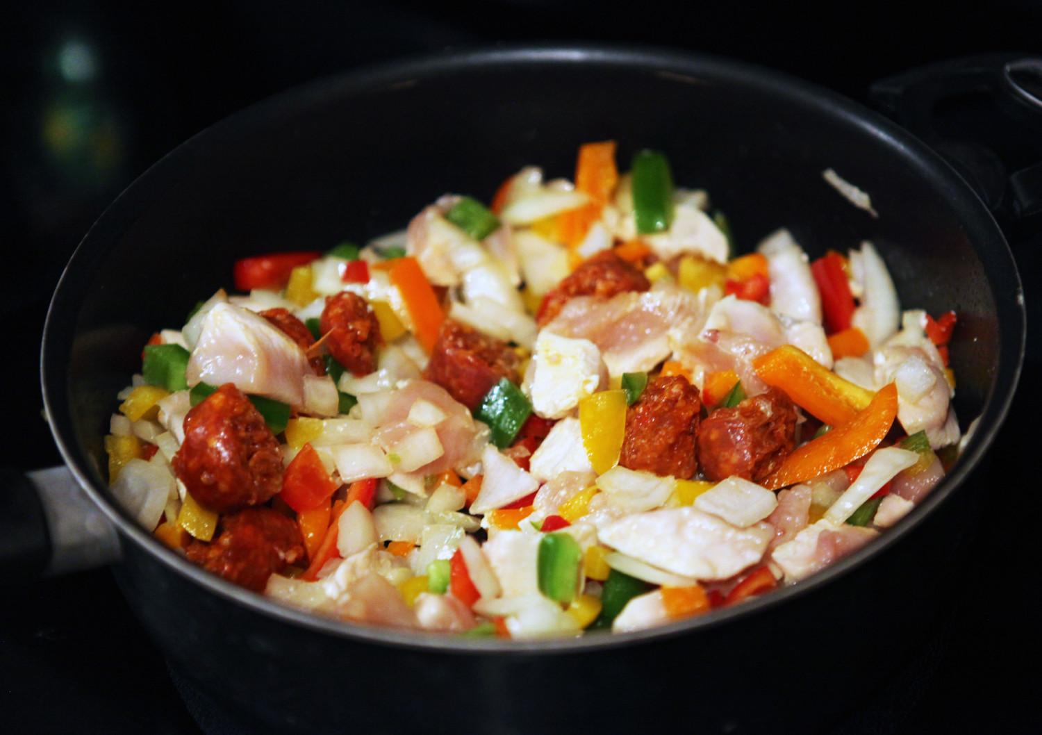 4. Add the onions, peppers, jalapeño, garlic and bay leaf and sauté until soft, about 5 minutes.